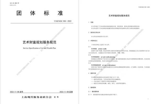 为确保艺术财富行业的规范有序发展,坚持“机构持牌、人员持证”的要求,由亚洲艺术品金融商学院提出立项,上海现代服务业联合会、上海现代服务业标准创新发展中心携手上海农村商业银行、上海人才服务行业协会、中国金融信息中心、上海市拍卖行业协会、上海市基金同业公会等单位共同起草发布了《艺术财富规划服务规范》团体标准。旨在通过规范艺术财富规划服务机构的管理与服务等相关内容,以产学研的方式培养艺术财富规划服务领域的复合型人才,推动构建艺术财富行业服务质量监管与提升体系,凝聚行业共识,实施全面质量管理,不断增强艺术财富行业服务质量提升的能力和水平。