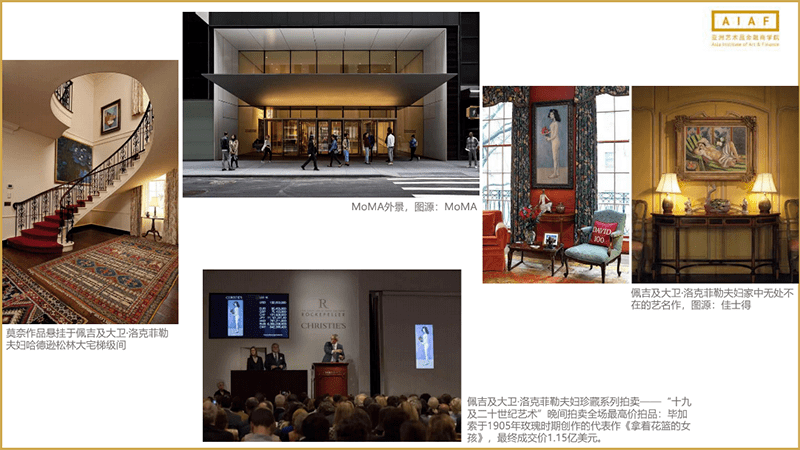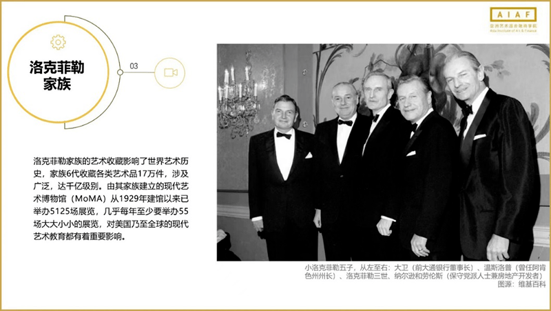 例如:世界闻名的洛克菲勒家族,从洛克菲勒家族神话的创始人约翰•大卫森•洛克菲勒算起,这个美国首屈一指的财富家族已经繁盛了整整六代且如日中天、独“富”天下。洛克菲勒家族,在艺术收藏方面它影响了世界艺术史。家族的六代收藏中,各类收藏达至17万件,内容涉及广泛,价值达到千亿级别,甚至其家族所建立的现代艺术博物馆MoMA自1929年建馆以来,总共举办了5000多场展览,而且几乎每年都要举办50场左右的展览,这对美国乃至于全球的艺术、教育都有非常重要的影响。
