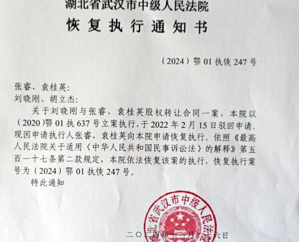刘晓刚说,(2024)鄂01执恢247号恢复执行通知书下达后,本人微信、社保卡等支付账户也被冻结。该冻结措施未经合法告知程序,直接导致他的日常生活及企业资金周转严重受阻,日常消费、业务款项往来等均无法正常进行。