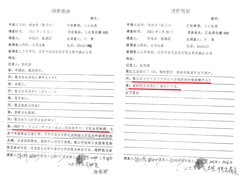 辽宁中盾稳公司法务李某荣在接受于洪区人力资源和社会保障局调查时称:张玉林出现症状时正在工地进行作业