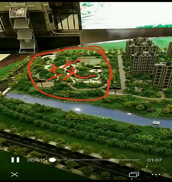 2015年售楼时的真实沙盘如下图所示,画圈的地方是原定的休闲区位置,现在是坟地。