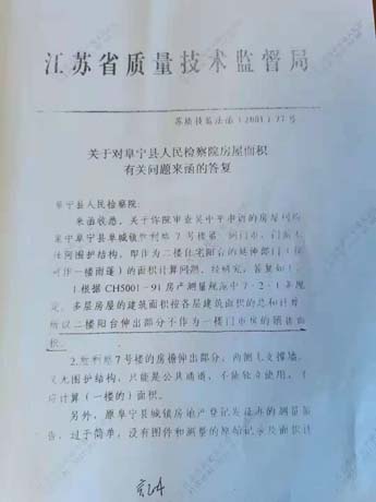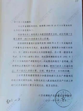 其三, 江苏省技术监督局苏质技监法函(1999)54号、(2001)77号,江苏省测绘局2001年9月12日、10月15日的复函中已证实:(1)申诉人门市房面前应是社会公共通道,不可以纳入门市房销售面积;(2)发证办的检测报告没有图文和测绘记录,不符合国家测绘行业标准CH5001-91,《房产测量规范》中9.2条第1—7款出具检测报告的有关规定。