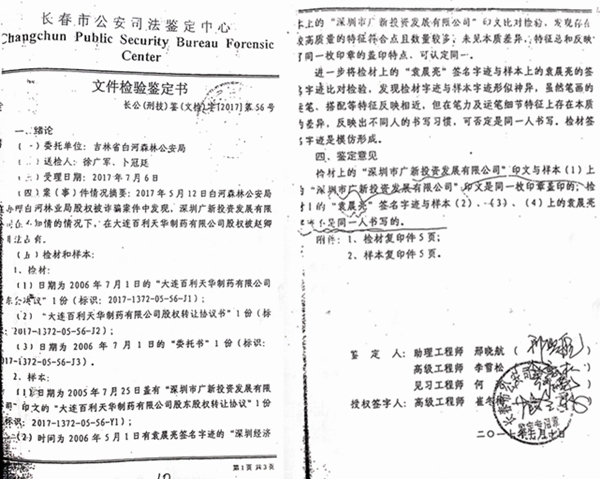 (1)2006年7月,赵卿全伪造赵卿全与广信公司股权转让协议书(经吉林省公安厅物证鉴定中心鉴定系伪造),将深圳广新投资有限公司持股62.94%过户至自己的名下;