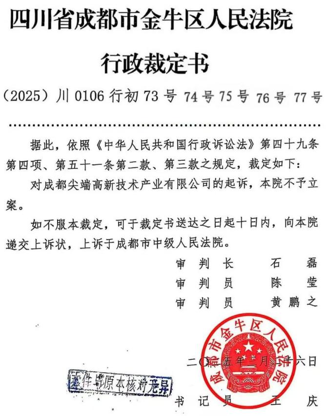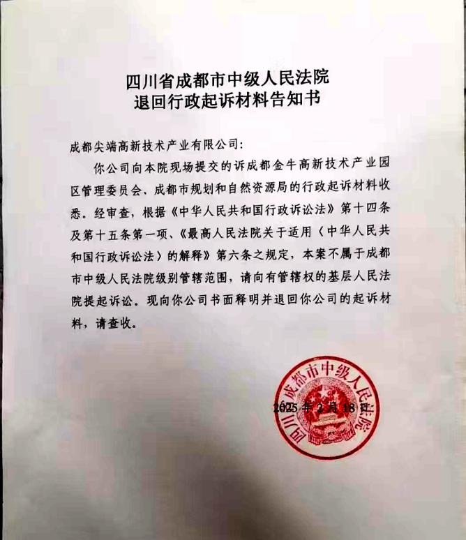 2025年2月,忍无可忍的尖端公司选择用法律维权。他们依据《行政诉讼法》,将成都市规划和自然资源局、金牛高管委告上法庭。然而,成都市中级人民法院以“不属于本院管辖”为由退回材料,金牛区人民法院则要求“一案拆五案”,行政裁定书(2025)川0106行初73号最终裁定不予立案。无奈之下,根据《行政诉讼法》相关规定,尖端公司又再次向成都市中级人民法院提起诉讼,法院已经收下相关材料,律师已经跑了多趟法院,但截止目前,尖端公司仍然没有收到该案立案的相关信息。