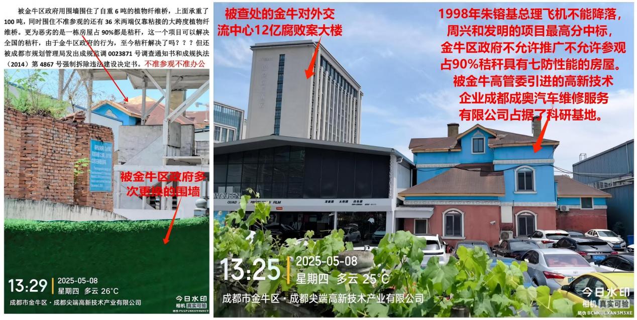 王先生说,此外,该创新项目还遭受了成都市规划管理局的行政干预。相关部门先后发出成规监调0023871号调查通知书和成规执法(2014)第4867号强制拆除违法建设决定书,导致相关场所既不准参观,也无法正常开展办公等业务活动。1998年,朱镕基总理前往四川时,因农民大量焚烧秸秆产生的浓烟使飞机无法正常降落。而周兴和先生发明的这一具有重要意义的项目,尽管在招标中以最高分中标,却遭到金牛区政府限制推广与参观。与此同时,原本由金牛高管委引进的高新技术企业成都成奥汽车维修服务有限公司,却占据了本应用于该创新项目的科研基地,进一步阻碍了项目的正常发展。