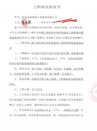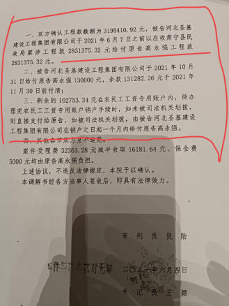 近期,接到河北沧州市肃宁县关于高永强先生向各大媒体投稿反映称;自己承包的养老院项目工程是民生工程款(包括农民工资2831375.32元)至今五年之久没有拿到,两次一审胜诉均胜诉,遭二审推诿扯皮,由于沧州中级人民法院审判法官张某梅、程某明两人涉嫌“枉法裁判”严重怀疑他们在办人情案,关系案。反复否决,致使农民工工资不能按时发放,造成农民工生病无钱救治死亡事件。据悉,2020年高永强与河北圣基建设工程集团签订(工程承包协议书)附有协议书为据。