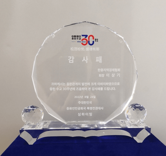 2022年中韩建交30周年之际,为感谢及赞许社团法人韩中地域经济协会会长李相基在中韩两国友好交流所做出的贡献,驻韩国大使邢海明授予其感谢牌。
