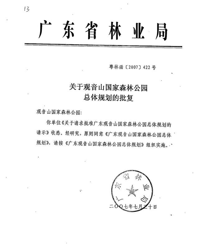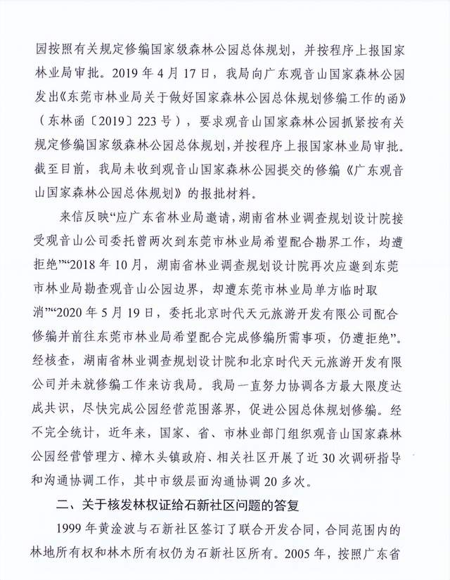 2017年7月17日,广东省国有林场和森林公园管理局致函观音山,要求及时按有关规定修编国家级森林公园总体规划,并按程序上报国家林业局审批。黄淦波说,应广东省林业局邀请,湖南省林业调查规划设计院接受我园委托曾两次到访东莞市林业局希望配合勘界工作,均遭拒绝。