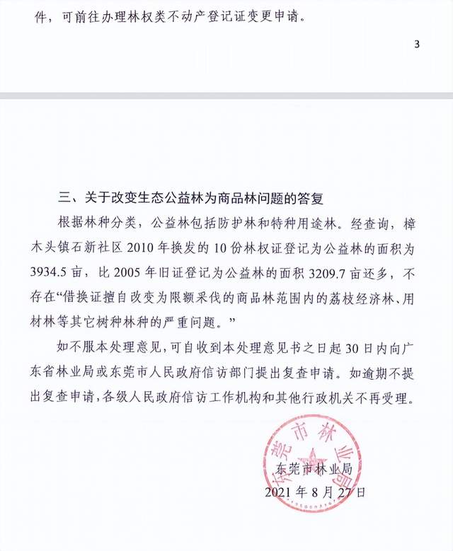 而在市林业局的信访答复书中称,樟木头镇石新社区2010年换发的10份林权证等级为公益林面积为3934.5亩,比2005年旧证登记为公益林的面积3209.7亩还多,不存在“借换证擅自改变为限额采伐的商品林范围内的荔枝经济林、用材林等其它树种林种的严重问题。”