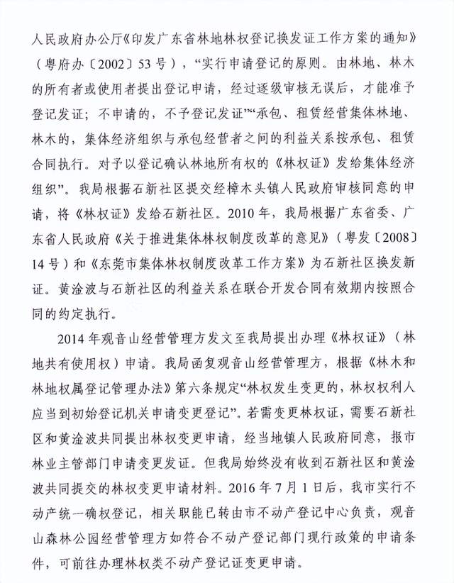据观音山管理方透露,此前,在2021年6月17日观音山公园向东莞市信访局反映要求调查处理观音山国家森林公园总体规划修编问题的信访事项(信访件编号:LX4419002021061753499)。该信访经市信访局2021年6月22日转交至东莞市林业局。该局于2021年7月2日受理,并发出了受理告知书。