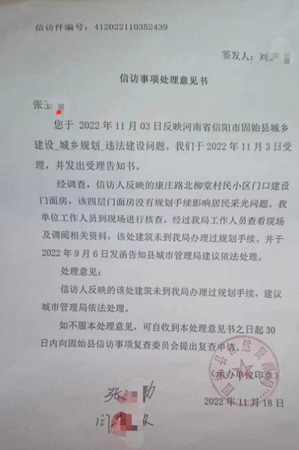 近日,河南省固始县南湖办事处八里松村柳塘村民组居民张某勤、闫某敏等人致函有关部门,反映村干部在其门前建一排违章建筑,严重影响其通风、采光、排水的问题。恳请上级领导听民声,察民情,解民忧,依法依规妥善处理,维护百姓正当权益。