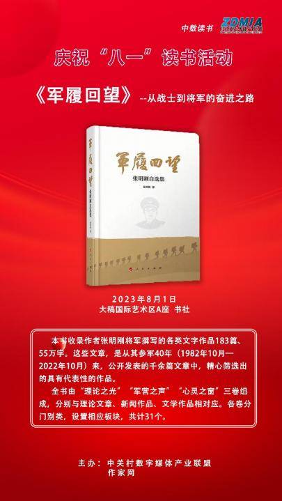 8 月 1 日, 为庆祝中国人民解放军建军 96 周年, 中关村数字媒体产业联盟、作家网在大稿国际艺术区书社举办了首场中数读书会—— 《军履回望》从战士到将军的奋进之路。