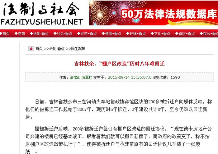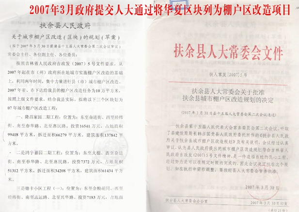 公开资料显示,早在2007年3月30日,扶余县(后改为市)人大通过的“扶余县城市棚户区改造规划的决定”,就已将德卡小区工程即“华夏区块”列为棚户区。同年,扶余市政府将这里列为棚户改造区,即“华夏棚户区”,共28300多平米,300多户,政府承诺第二年年末就能改造完迁回。之后,地产商按照合同要求建起楼房,将拆完房子的270多户居民安置完成,唯独沿街的这趟门市房迟迟拆不动。这趟沿街房有三千多平方,加上后院几处房子和院落,约一万多平方米,共30多户。这三十多户回迁户,一等就是15年之久,而且还不知要等多久!