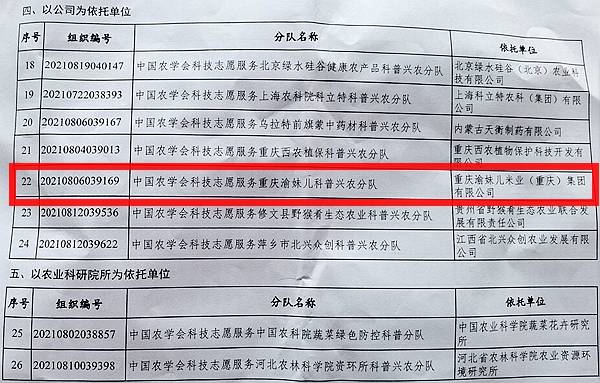 为了促进渝妹儿米业(重庆)集团有限公司(以下简称:渝米集团)事业稳健发展,培养大批农村本土科普人才,辐射带动全民提升科学文化素质,促进乡村全面振兴,近日,渝米集团等47家单位向中国农学会申请成立中国农学会科技志愿服务分队,中国农学会依照中国科协《科技志愿服务管理办法(试行)》和《中国农学会科技志愿服务分队管理办法》进行了合规性、专业性和可行性审查,最终,同意成立的第二批60支中国农学会科技志愿服务分队中,重庆仅有2家,其中一家就是重庆渝妹儿科普兴农分队。