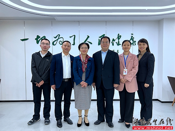 ▲捐赠仪式后,长沙市工商联副主席田桂元(左三),迪姆锦源董事长吴余生(右三)等与医院领导合影