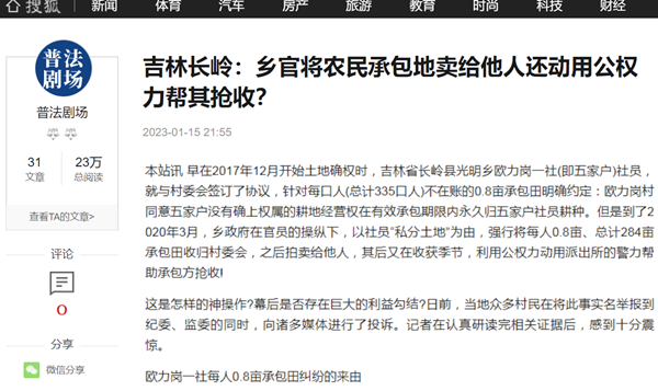 本站讯 早在2017年12月开始土地确权时,吉林省长岭县光明乡欧力岗一社(即五家户)社员,就与村委会签订了协议,针对每口人(总计335口人)不在账的0.8亩承包田明确约定:欧力岗村同意五家户没有确上权属的耕地经营权在有效承包期限内永久归五家户社员耕种。但是到了2020年3月,乡政府在官员的操纵下,以社员“私分土地”为由,强行将每人0.8亩、总计284亩承包田收归村委会,之后拍卖给他人,其后又在收获季节,利用公权力动用派出所的警力帮助承包方抢收!