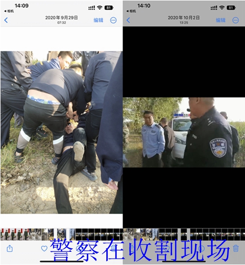 2020年9月29日,乡管理人员李立坤、李金牛、蒙有全带着二十多个乡派出所的一些警察和工作人员来到一社耕地现场帮助王海进行抢收。村民们向记者介绍:乡政府带去的人和警察,先是用强硬手段将村民控制住,然后开始强行收割庄稼,在此期间,但凡有敢阻拦者不论男女老少一律控制。