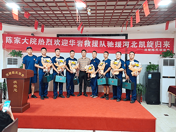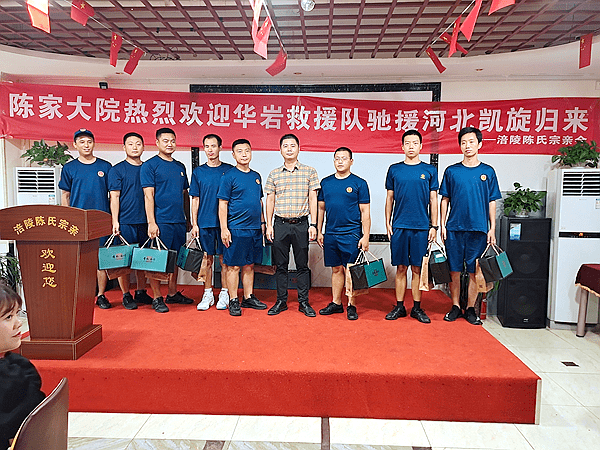 陈氏宗亲会秘书长陈廷卫在致辞中说:“代表涪陵陈氏宗亲会全体陈姓族人和陈家大院(江湖菜)对凯旋归来的驰援河北抗洪抢险英雄们表示热烈的欢迎!一方有难,八方支援。在抢险救灾过程中,统筹兼顾,协调有力,措施得当,发挥了榜样的作用。接下来,将带领涪陵辖区的陈姓族人,学习和弘扬华岩救援队队伍的能战斗、能克硬、能吃苦、有爱心的精神。”