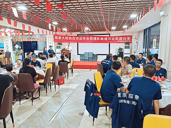 “洪水无情,华岩有爱”8月6日,来自重庆市涪陵区华岩应急救援队与永川区华岩应急救援队的14名队员在奔赴河北涿州抗洪救灾圆满完成任务后平安凯旋,在涪陵东高速收费站出口,受到华岩队员们及社会各界人士的热烈欢迎。涪陵陈氏宗亲会还特别邀请凯旋归来的英雄们到陈家大院(江湖菜)餐厅免费共进晚餐。