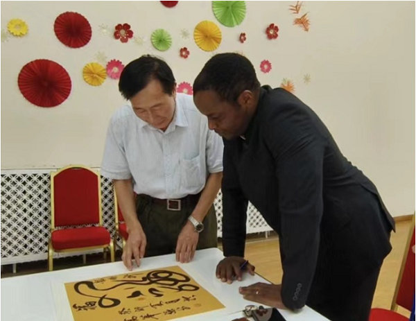 中名联签约国礼书画家高华强老师对中名联赵苹老师的引荐和平台推广表示衷心的感谢,认为活动安排组织的非常严密,井然有序,气氛友好祥和;通过相互交流,对喀麦隆国情、民情、国旗图案及与我国在经济、文化等方面的友好合作交流开扩了眼界,增长了见识,增进了中喀两国友谊;特别是过去书法作品通过国内领导人送给希腊、法国、新加坡等国外政要,今天能作为传播中国文化和文明的使者,亲自将创作的《龙腾祈福》书法作品,作为国礼交给外国政要永久收藏,使自己感到十分荣幸和自豪。