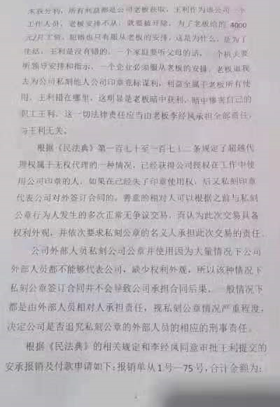 根据《民法典》的相关规定和李经凤同意审批王利提交的安承报销及付款申请如下:报销单从1号—75号,合计金额为:333561.57元。1、报销1800元;2、报销5367.6元;3、报销6336元;4、报销1969.9元、121.4元;5、报销18700元;6、报销18700元;7、报销2302.48元;8、报销无发票;9、报销3381.8元;10、报销428.92元;11、报销10000元;12、报销10000元;13、报销834元;14、报销834.5元、3381.8元;15、报销3381.8元、848.92元;16、报销8193.52元;17、报销1969.9元、121.4元;18、报销103.1元、923.6元;19、报销2905.07元、7.9元;20、报销913.42元;21、报销2339.15元;22、报销3655.54元;23、报销225.2元;24、报销834.5元;25、报销2302.48元;26、报销428.92元;27、报销1020.18元;28、报销400元;29、报销247.5元;30、报销无;31、报销无;32、报销无;33、报销无;34、报销无;35、报销无;36、报销无;37、报销无;38、报销无;39、报销1800元、8193.52元;40、报销8193.52元;41、报销121.4元;42、报销923.6元、1147.2元;43、报销225.2元、288元;44、报销288元;45、报销550.95元;46、报销10000元;47、报销834.5元;48、报销428.92元;49、报销1202.96元;50、报销247.5元、251.03元;51、报销251.03元;52、报销112000元;53、报销273元;54、报销200元;55、无;56、无;57、报销1800元;58、报销1800元;59、报销5600元;60、报销5600元;61、报销5367.6元;62、报销6336元;63、报销6336元;64、报销6336元、103.1元;65、报销121.4元;66、报销1969.9元、923.6元;67、报销1548.91元;69、报销288元、225.2元;69、报销225.2元、225.2元;70、报销913.47元、913.42元、71、报销913.42元;72、报销3655.54元、2399.15元;73、报销10000元;74、报销2399.15元;75、报销660元;10000元以上75张发票报销:333561.57元。根据重庆市安承实业发展有限公司法人代表李经凤所审批同意王利报销申请75份申请报销333561.57元,这充分证明了重庆市安承实业发展有限公司法人代表李经凤授权给王利去刻他人公司印章所造成的一切法律责任和经济责任应当由重庆市安承实业发展有限公司承担法律的全部责任和经济责任,应当追究李经凤的刑事责任。