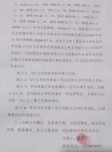近日接:四川省内江市资中县双河镇长堰塘村7社8号村民王利反映他说: 他于2021年8月4日进入重庆市安承实业发展有限公司上班,担任行政管理工作,公司老板李经凤,就逼王利去私刻他人公司印章竞标,重庆市安承实业发展有限公司法人代表李经凤,统一社会信用代码为:91500108MA050XK91,企业地址位于重庆市南岸区野猫溪正街3号2-4号,所属行业为电力、热力生产和供应业,经营范围包含:许可项目:建设工程施工;建设劳务分包;输电供电、受电电力设施安装;维修和试验;发电业务、输电业务、供(配)电业务;检验检测服务;电气安装服务。该公司属于弄虚作假多年公司,不值得信赖的公司,该母公司就连自己的职工都要推水深火热之中去,面临自身灭亡的公司,这样的公司背后还隐藏得很多不可告人的秘密。