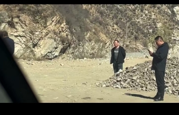 合同约定,由牛同斌带领工人负责清理连崖年山顶700多米旧道路的废渣及周边垃圾,3月16日工人、机械开始进场施工,在2025年3月26日下午两点左右,施工现场突然出现几名不明身份人士开着两辆车(附有现场人员车号图片)