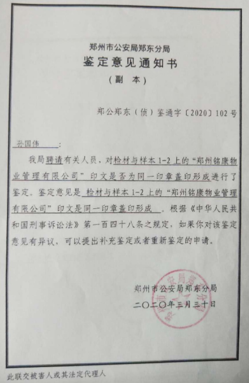 然而郑州公安局物证所给郑东分局办案单位却出具了所送检材1-2源于同一枚印章的结论、2020年3月30日办案人将此明显错误的所谓鉴定让受害人孙国伟看后不让受害人孙国伟复印也不让拍照、并照此出具同一枚印章结论见图片
