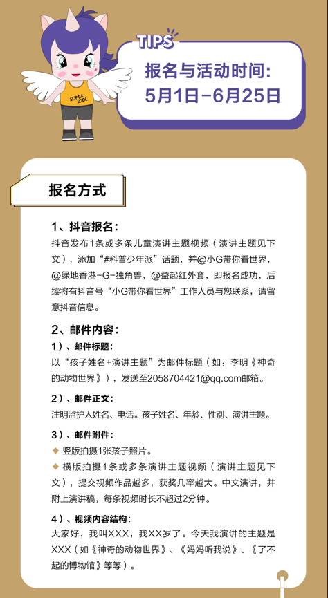 活动目前正在火热报名中,凡是报名的小朋友都有机会参与到WETALK青少年演讲和WEACTION青少年游学的线下活动中。拥有好奇心和行动力的少年们,赶快参与到科普少年派中来,共同为公益发声,做时代的少年榜样吧!更多详细信息,详见微信小程序“G房豆豆云店”。