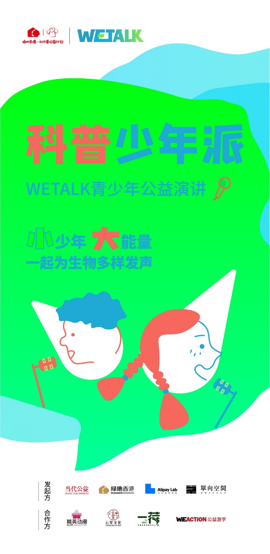2022,“绿地香港·红外套公益计划”全新升级,作为升级后的第一弹:“绿地香港·红外套——WETALK青少年演讲”公益活动正式启动。此次活动以“科普少年派——小少年 大能量,一起为生物多样性发声”为主题,联合当代公益、支付宝空间站、单向空间等多家企业共同开展,活动以公益为纽带,以科普和生物多样性为话题,通过儿童演讲与游学等多样化的活动形式邀请6-18周岁热爱自然、热爱生物、热爱表达的青少年儿童报名参加,活动不仅为孩子们准备了丰富的奖品,更为孩子们搭建了一个绝佳的展现自我、快乐成长的舞台。