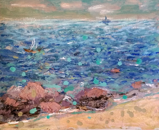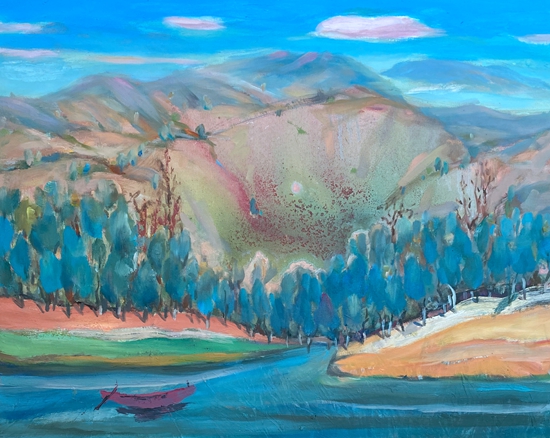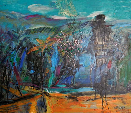 走近她的作品,就像走进一个世界,这个世界充满了阳光色彩、激情乐章,在画面的结构和色彩方面,走进自然,又不抄袭自然,既有主观处理,又有客观依据。在画面的表现形式上,不基于某种单一的形式,充分运用把控材料的特点,坦培拉、油彩、色粉笔、油画棒,丙烯等多种西方材料的综合叠加、处理、晕染、罩染、釉染等多种东方绘制手法的运用,使得画面既苍凉又温婉,既大气又神秘,即粗犷又细腻,其可看可品的内容很多。