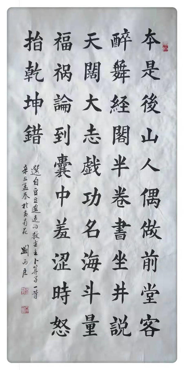 刘丙臣,男,1956年生于北京市石景山区,号玺英。自幼喜欢习练各种书法,主攻隶书。习书法50个春秋,先习颜真卿多宝塔,勤礼碑,后转隶书曹全碑礼器碑再及二王。