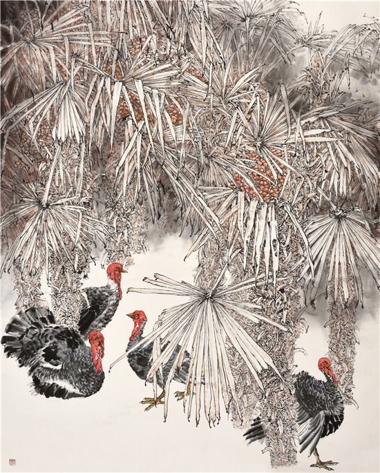 她的作品,既注重形式更讲究笔墨。每一幅构图都精心推敲,在构成上大胆出新、出奇,给人以强烈的视觉冲击;同时,她充分利用线条来表达物象,通过用笔的技巧,灵活表达物体的本质精神。不论是枝叶还是树石,不论是飞鸟还是草虫,都能做到笔简意繁,态随意变,前人所谓的“寓刚健于婀娜之中,行遒劲于婉媚之内”,正是她用笔方法的具体体现。通过轻重,深浅、虚实的线条变化,真正做到了柔中带刚,一笔三战,有皴擦,有顿挫、有勾斫,笔断意连,一气贯穿,从而在画面上使人看到的不仅仅是笔墨更是具体物象的形神传递。