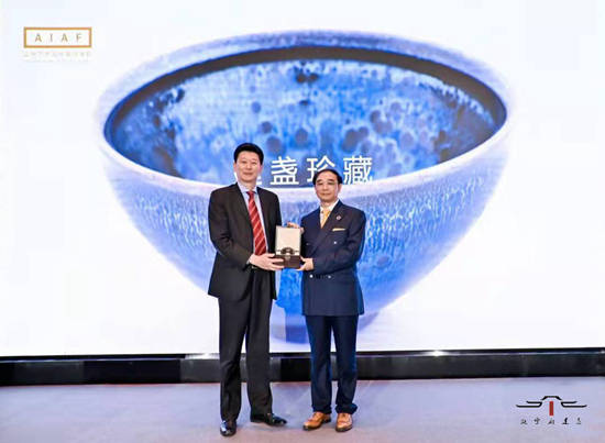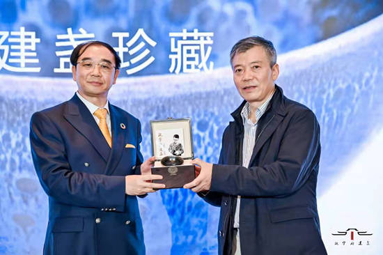 范勇院长向中国酒业协会固态白酒原酒委员会理事长谢明赠送瓯宁府建盏