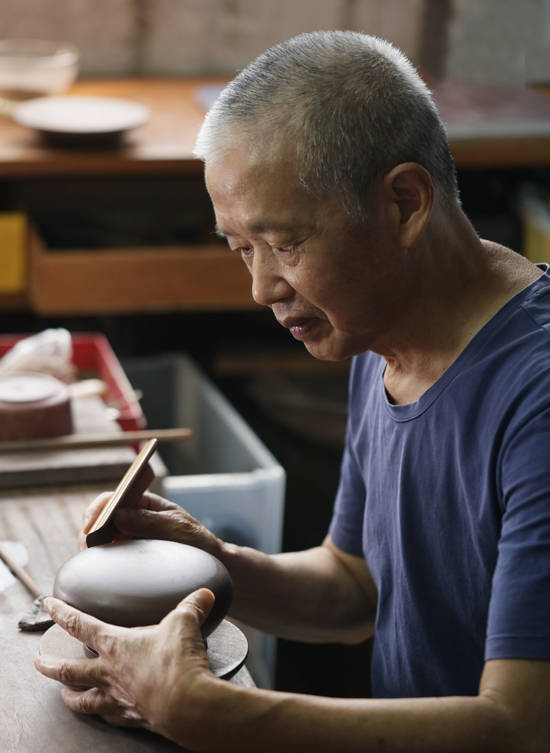 此次选择与赵江华先生合作实乃荣幸,赵先生与我父亲同龄,我们同属虎,性格相投。作为顾景舟大师弟子,先为顾景舟大师的保健医生,后由顾景舟大师亲授制壶技艺,跟随顾景舟身边18 年之久。他为人低调、内敛、不张扬,他所创作的紫砂器一度成为海内外很多紫砂刊物的封面、封底之作,也是收藏家极力追捧的对象。每每见他认真做壶,我的内心总有一种灵魂的洗礼和精神的升华。因为,在他心中,传承好紫砂技艺就是对顾景舟大师最好的传播,不能中断,只能接续。说心里话,我喜欢他做的壶,质朴大气,古雅敦厚,有深刻的悟性,有独特的表达,更有让人敬畏而赏心悦目的静美,令人悠然神往。