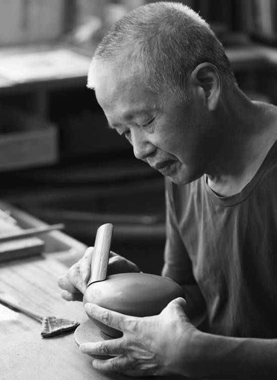 如今,老师已经是众多收藏者追捧的制壶名家,但他仍然孜孜以 求,希望自己可以把顾老的技艺继承发扬。他说自己年纪大了,也常 感到力不从心,但每天都想挤点时间在作品上,想着“器形轮廓线组 合上要和谐,要从点线面提高审美素养,还要在用一双发现美的眼睛 去过生活,吸收源源不断的灵感。”