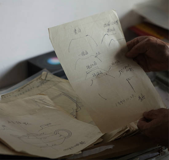 “ “工欲善其事,必先利其器”,这是顾老时常在我耳边提到的一句话。顾景舟在改革创新制壶工具上,就已超出前人。他说 :“要学壶,先学做工具,工具做不好,就不能做壶。”由此,我们不难看出顾景舟在六十多年的制壶实践中对工具的重视。这是因为紫砂壶的成型独特,他不用辘瘘拉坯,或用成型的模具,而是坚持用泥片镶接和打身简的传统方法成型。百壶百样,不可能用万能工具,不同的壶型,用不同的工具。所以顾景舟的制壶工具,就有好几大箱,有几千件之多。由于顾老年纪大,紫砂工艺制作中大多数工具必须自己动手制作,所以一些粗大力气活都由我完成,然后顾老做精细加工,凡制作一件 , 他会从头到尾把原理解释一遍,要求注意事项,比如对做“蓖子”提出要“让”,顾老说 :“生活中要学会让一让,让步、让位,不要争、不要抢,凡事做到让,自己做事就顺当。蓖子也同理,在一条弧线两边要让,做壶时就顺当,不会磕磕碰碰。”