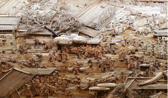 纪智先生倾情打造黄花梨木雕《纪智补全版清明上河图》原作总尺寸长88米、高2米。共用黄花梨木20余吨,整幅作品采用“浮雕、透雕、圆雕、镂雕、层雕、禅雕等”多层次“风采横溢,妙在画外”的创新技法,将张择端本《清明上河图》以珍稀木材再现于世,作品栩栩如生,人物、景观造型逼真,呼之欲出。此木雕作品已获国家版权登记,并于2019年荣获第四届“中国林业产业创新奖”。诚如中国美术家协会副主席,清华大学艺术与科学研究中心主任,清华大学美术学院院长鲁晓波先生所言,“纪智先生用新工艺对美术名作进行延伸开发的文艺创作与文化传承的思路,在这幅独一无二的黄花梨木雕艺术品上,表现得淋漓尽致,使之成为中华木作文化的一个奇观”。