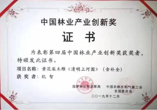习主席在谈到文化自信中提到:“一种价值观要真正发挥作用,必须融入社会生活,让人们在实践中。”近年来不断涌现的新国潮,新国货,代表着消费的新趋势,更是文化自信在新消费浪潮下的具象体现。基于新的消费背景和发展现实,催生出大量的文化消费需求,这就需要未来有更多的文化资源“活化”,激发出文化和产业融合的新型传播力。经过公司决策层研究,我的思路更加清晰了。开封市清明上河图研究会授予纪智先生创作黄花梨木雕《纪智补全版清明上河图》最佳创新奖。首届清明上河图文化论坛组委会授予我“特别贡献奖”。这些荣誉让我更加觉得身上的使命感更加重大。我多次到京交流,原国家文物局副局长、中国收藏家协会名誉会长闫振堂老先生鼓励我“在木作文化传承和创新的路上,步子越迈步越坚实”。