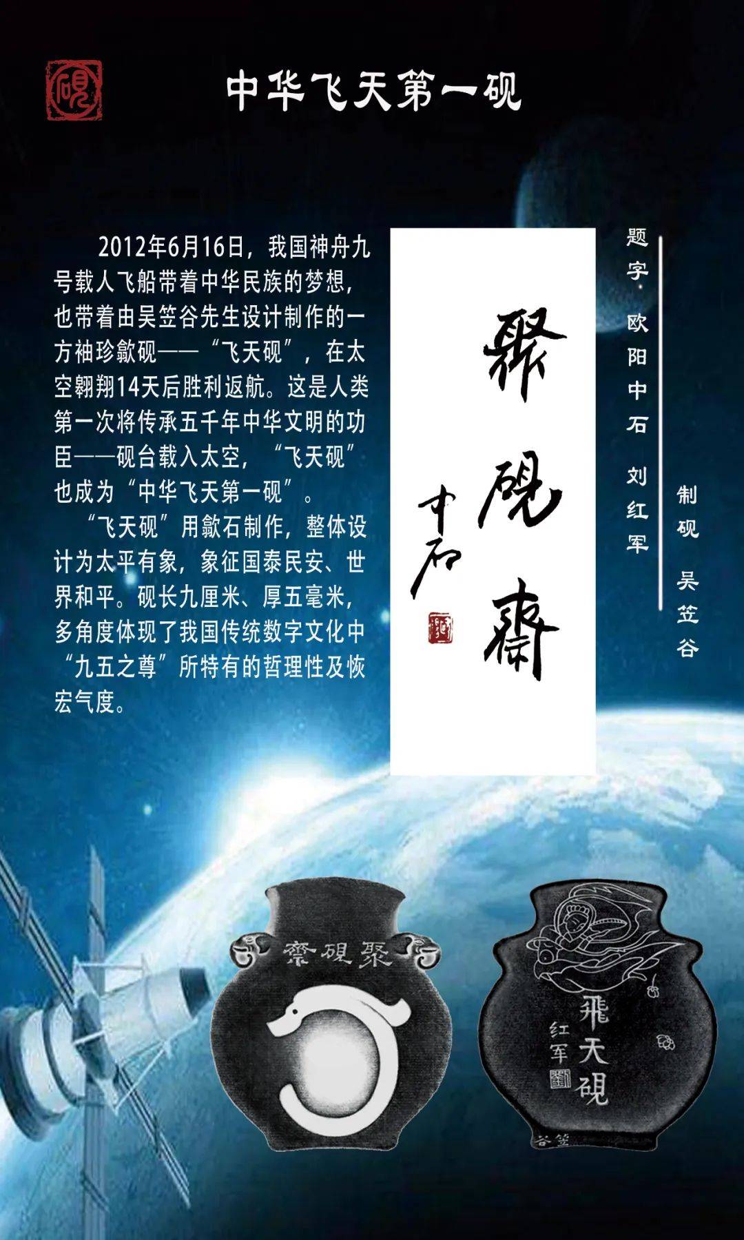 时间虽然过去了十一年,谈及名砚飞天,刘红军会长依然难掩内心激动:“古有女娲补天,今有神九探穹,将传承五千年中华文明的功臣-砚台,送上天宫遨游太空,是人类历史上的第一次,具有深远的历史文化意义。这不仅是当代传承、弘扬中华砚文化事业的一次腾飞,也是中华砚文化史上一次划时代的突破,更是中华文明伟大复兴的又一里程碑!”