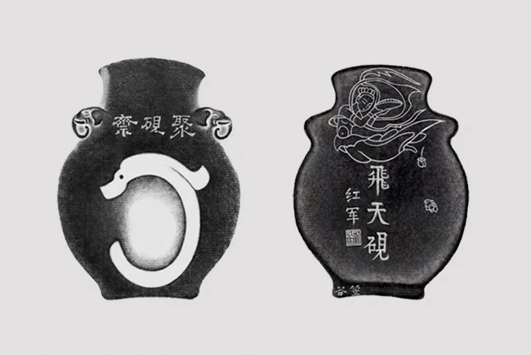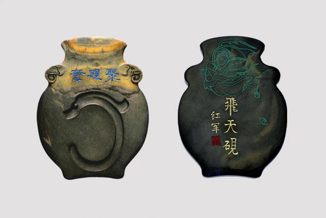 此砚采用上等歙砚石制成,砚长9厘米、厚5毫米,砚面雕成象耳宝瓶形,寓意“太平有象”;一对瓶耳之间刻有“聚砚斋”三字;砚池造型为新石器时期红山文化“C”型玉龙,砚背上部线刻敦煌艺术中优美的“飞天”形象,体态轻盈,飘逸潇洒,从砚雕艺术上看此砚刀法精练,小中见大,创会会长刘红军将军亲笔题写砚铭为“飞天砚”。据介绍,此砚的雕刻者是吴笠谷老师,他为砚雕大家、古砚收藏家、砚文化学者,曾任中华炎黄文化研究会砚文化研究分会副会长兼专家工作室主任。此砚在对外巡展中,展台前可谓人头攒动,观众都争相一睹其风采。