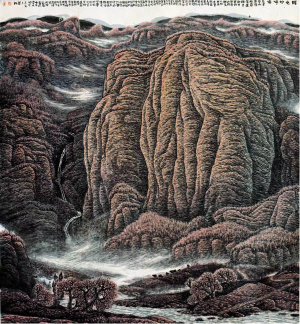 像范宽这样伟大的北宋山水画巨匠,画史对他的生平记载却很简略,究竟生于何年,殁于何载,只是个大约年号。其它诸如绘画活动、艺术、思想等除三言两语外,一片空白,这可能因为范宽是平民画家的缘故吧。因此,对于范宽其它史料的记载是否真实无误,或有偏颇,就大有商榷之处。有趣的是,1989年冬,我去照金山脉写生,鬼使神差,突然感悟到范宽山水画的根脉就来源于鲜为人知的照金山脉。一天清早,我准备上山写生,拉开门,纷纷扬扬的鹅毛大雪,覆盖了大地,一片迷茫。我庆幸在这大山中,能看到如此美妙的雪景,真乃天赐我也。稍停,大雪渐止,我差点惊呼:眼前之景不就是范宽的《寒林雪景图》吗?于是,我在后边的写生过程中,便留意对这里的几座名山、溪流、瀑布、山崖、坡地、林木等进行观察研究,并作焦墨写生数十幅。渐渐地把范宽的《溪山行旅图》与照金山脉联系起来,岂非天作之合。既然“范宽故里距照金很近,起步可至,那么,在古代交通、讯息极不便利极不发达的情况下,范宽难道可以舍此壮美山水,忘情远方山水乎?这里并不否认史书记载范宽“多往来雍、雒间”,又“移居终南山、太华山,终日观览山水,以求其趣”的史实。作为山水画家,博览广采,吸纳更多营养,胸有无尽丘壑是山水画创作的必备条件。但我要阐明是,范宽山水画的气象、气质、魂魄及精神内涵是以照金山脉为根基的。尤其《溪山行旅图》,作为范宽山水画的代表作,更是集中体现了照金山脉的雄浑博大与恢宏壮阔。不论从自然景观和人文景观考察,这无疑是一件地域性很强的宏图巨制和伟大作品。范宽“师古人,末若师诸物也,吾与其师诸物,末若师诸心”的艺术主张,在这件作品中,得到了最鲜明的体现。 《溪山行旅图》画面中央的主峰,如巨碑矗立,伟伟乎直冲霄汉,显示了画家浑厚雄强、顶天立地的精神气度。山顶上灌木丛生、密而有序、一派苍茫气象。如线一般的瀑布,自山体腹间流出,涓涓有声,美妙无比。主峰右侧有一低矮山峰,与主峰对坐,形成呼应。中景以上,雾霭蒸腾,烟岚迷漫,使整幅作品产生了一种强烈的高耸、伟岸之感,也与上端产生了距离。中景两崖间,瀑布喷泻,飞流激荡而出,汇成溪流山涧,流出画面。两崖上树木茂密生长,各尽其态。顶端有似针叶一样的林木,屋宇楼阁藏于其后,错落有致,耐人寻味。近景巨石横卧,坚不可摧,这无疑对画面耸立感起到稳定作用。近景与中景间,几条横线,形成沙石坡角。四条小毛驴负重夺路而出,两个北方汉子一前一后,赶毛驴匆匆前行。这无疑对厚重、深邃的《溪山行旅图》增添了一种轻松愉快的感觉,使画面产生了音乐感和灵气。
