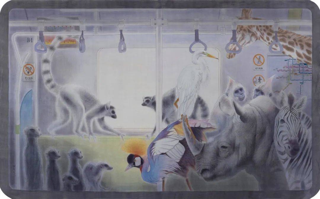 罗翔所进行的工笔画探索正呈现了这种图像的观念化建构。他在“2016·中国百家金陵画展”获得大奖的《欢乐谷》,便标志着他的这种“当代性”转向。大象、斑马、犀牛、熊猫、皇冠鹤、火烈鸟、长颈鹿、环尾狐猴……这些本是在城郊豢养的动物却突然出现在我们每天乘坐的地铁上,这是种什么感受?这当然不是真实的现场。但电影中常有这样的故事和镜头,因某个动物园失控而让豢养的动物肆意行走在繁华的街道、闯入人类正常的生活秩序。不论故事真假,但人类与动物的关系在现代文明中却成为观赏与被观赏、奴役与被奴役的关系。《欢乐谷》的图像观念就在于画家不再沉迷于对花鸟自然时空关系的描写,而是出人意料地将这些欢乐谷里的动物闯入人间。它们无意之中走进了地铁,用探索的目光来观看人类及人类发明的交通工具,甚至它们隔着车窗玻璃观赏着人类和人类居住的城市。