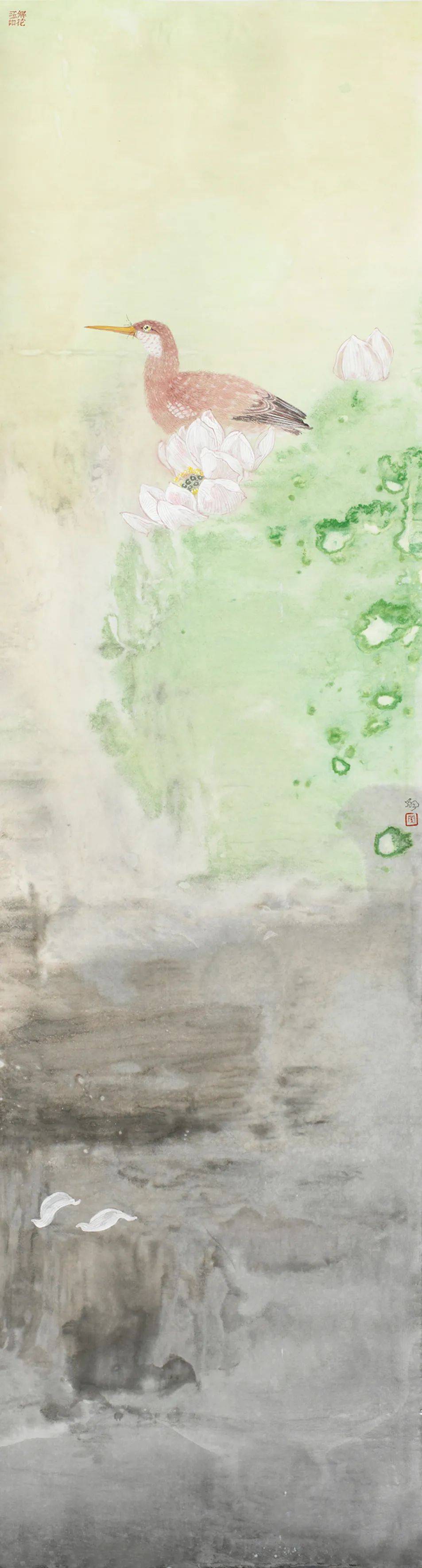 罗翔工笔画的这种“当代性”探索并不意味着他忽视传统,实际上他正是从传统花鸟画体系里走出的当代花鸟画家。在中央美术学院就读本、硕期间,他有幸师从郭怡孮、姚舜熙等先生,跟随他们数度赴西双版纳等地写生,练就了一手白描写生的功底,也像乃师一样擅长密体全景花鸟画。《冬至初寒》《空山新露晚来秋》《润物细语》和《幽林幽谷浴新影》等都代表了新世纪之初他在研习传统之中的出新,画面之中的线与色开始出现一种隔离式的变化。繁密、匀称、精微,或许是这些花鸟画具备一定现代艺术语言的特征。与这种无处不勾、无处不工的全景工笔花鸟画相比,他也探索过水墨花鸟画。这些水墨花鸟并非水墨意笔,而是大面积地在背景上,以色、墨、水相互撞色撞水而出,只有鸟仍然保留着精微勾染的特点。画面整体往往以淡墨为主,意境清幽。在这个相对传统的时期,画于2013年的两幅作品颇惹人注目,一是《北海北》,二是《万物生之瞰》。前者以富于流动感的鹭鸶充盈画面,单色水墨为基调,只有一束斜射的光照进中间那几只鹭鸶。此作并非纯粹的工笔画法,也非鹭鸶祥禽的装饰审美追求,而凸显了群禽在自然之中的生息与狂野。后者则画了并非一般意义上的花与叶,画面中扑飞的硕大的花蝶远远超出了真实的比例。显然,画家在此也试图在审美上突破一种观赏性,而对万物生态引发思考。或许,这两幅作品的实验性才让他最终完成了工笔画的“当代性”转型。