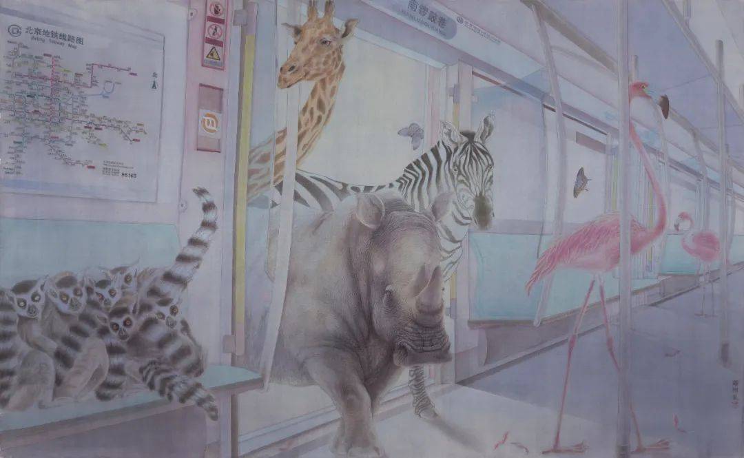 《南锣鼓巷》描写了在地铁玻璃门打开的瞬间,斑马、犀牛、长颈鹿、火烈鸟挤进门时的情景,而一群环尾狐猴早已落座,占据了座位。“南锣鼓巷”这个北京老城区的地标,在此恰恰形成了一种文本与图像的对比性,虽然画家只借用站名“南锣鼓巷”这个文本进行勾联。《晨曦迪士尼》终于在地铁里出现了穿着迪士尼小丑服饰的人的形象,威猛的狮子、顽皮的猴子、高雅的鹭鸶等都专注地观看着他幽默滑稽的形象。画面用细微的晕染表现了晨光熹微之中光色的冷暖交替,仿佛是人们清早赶到迪士尼乐园,却出乎意料地看到了另一番场景。在有关“归”的主题的三幅作品——《归途》《归程》和《归》中,画家描写了大象走出地铁玻璃门的瞬间所流露的迷途知返的一种安然,仍然在玻璃门紧闭之中找不到出口的犀牛、斑马,甚至误把入口当作出口的北极熊的那种焦虑,等等。