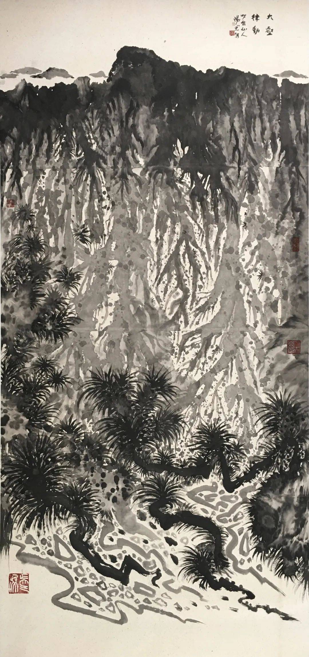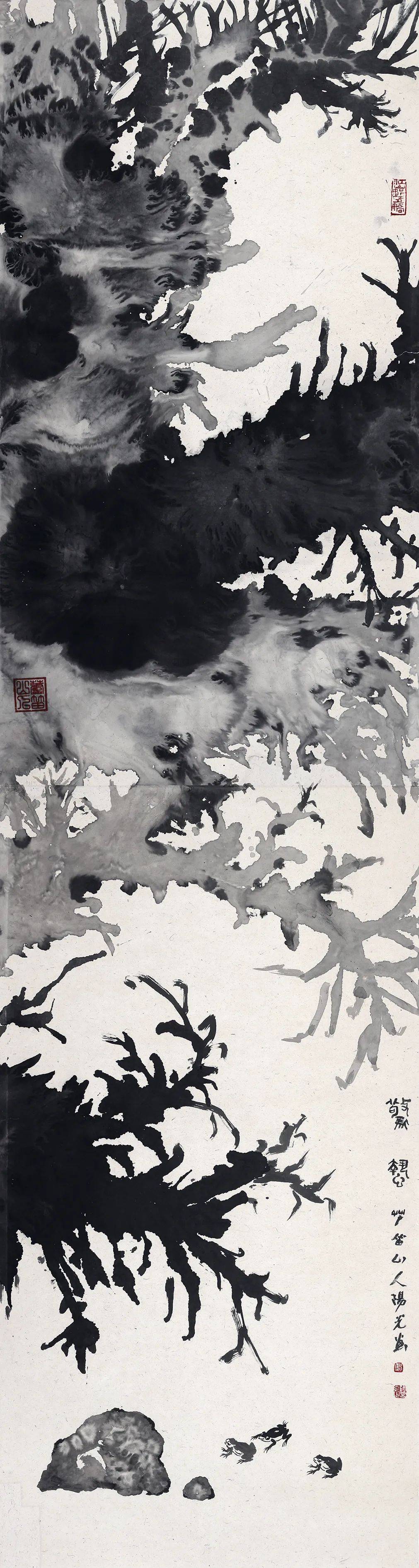 总体而言,阳光所聚焦漓江的山石、花草树木,通过泼墨加皴擦点染、浓淡相破的技法,保留作画过程中的偶然性因素,画面布局吸收现代构成的表现方式,同时保留中国画的笔墨语言,力求一种中西融合的水墨画新气象。在这其中,他所用到的技法是泼墨——水破墨或者墨破水,特别是在大幅作品中撞水、撞墨、撞彩,升华笔墨的美感,从而达到具有冲击力的视觉效果,这需要大破大立的勇气。