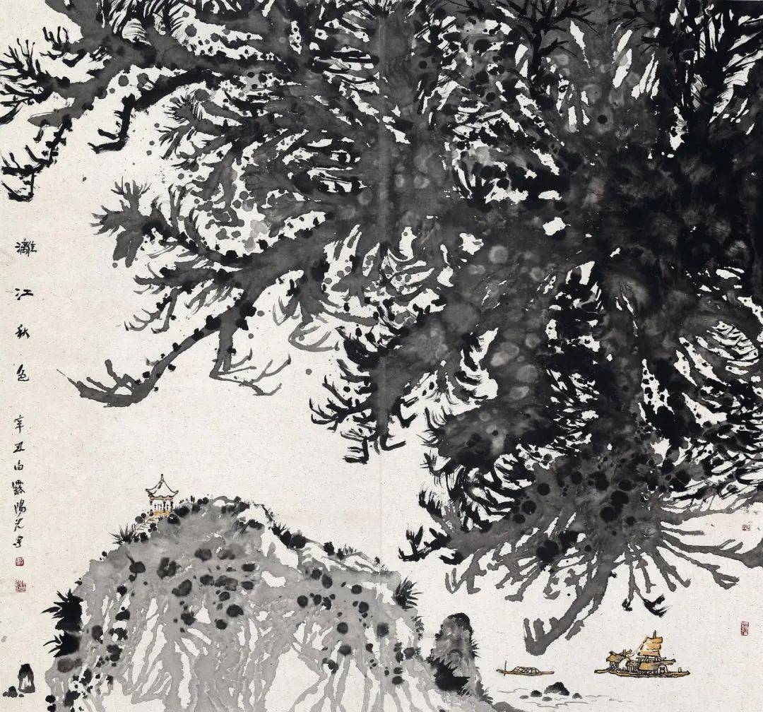 在“漓江探源”主题下,阳光近些年画了一些笔简意赅、尺幅较小的作品,以“桂林洞奇石美”“花非花”“家乡风情”诸系列为题。而他的大画,磅礴大气、饱满郁勃、激情满纸:“漓江山水”系列中的《漓江岚韵》,意象的象鼻山在墨迹的变化交汇中,形成一种网状的抽象水墨语言,与写实、精巧的渔船形成鲜明的对比,营造出新异的审美效果;《漓江之源》则用抽象的墨线构成动态很强的图像来表现“源”的主题,充分凸显了创作意图——在笔墨的桂林山水世界中,阳光致力于“自家造稿”,为观者展现出另一番不同风貌的桂林。