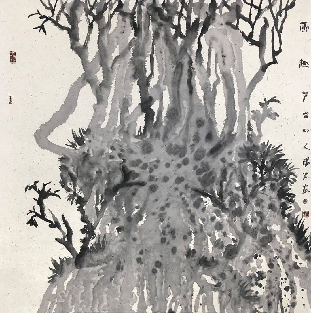 阳光的“古树”系列作品,纯水墨、不着色,满纸老干嫩枝、藤蔓缠绕,原有的山水那种“芦笛逸清音”般的印象,在这里变为重如沉雷般浑茫与浩思。在创作中,阳光将干湿浓淡自由挥写,尔后用墨点苔痕,用水冲撞,勾写与泼染结合,透出“笔晕墨章”的华滋——以古树为代表,进一步呈现出山非山、树非树、石非石、花非花的物象表达,构成了具有现代性的语言图式——阳光画的不是漓江所见到的某种树的品种和外形,而是呈现漓江两岸古树的总体精神和气质,所以称之为“古树之气”,也是时代之气。