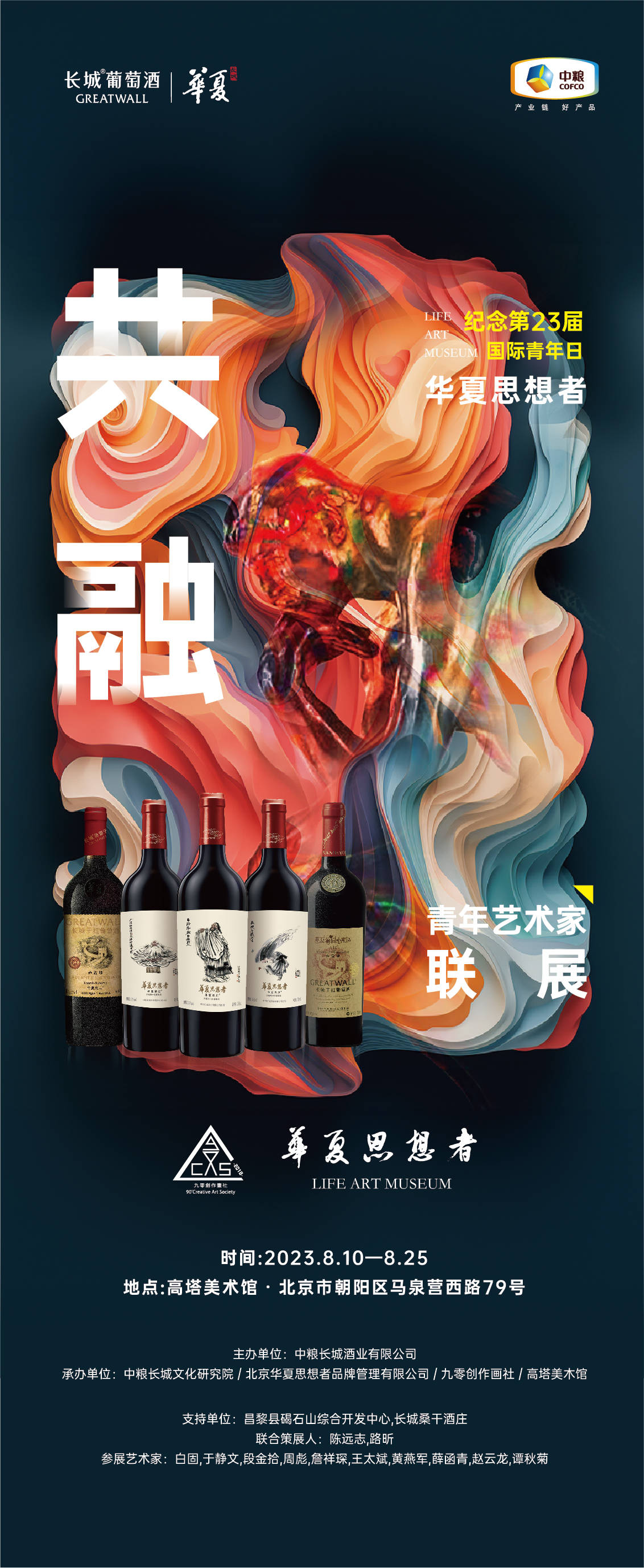 本次青年艺术联展为纪念第23届国际青年日,同时展览恰逢长城华夏建厂35周年纪念日,以共融为主题,旨在探讨当代青年使命、葡萄酒文化、产业创新与文化融合间的深层次联系,为弘扬和展现当前青年的责任担当与使命情怀,积极探索艺术资源与产业发展的融合创新而努力。本次展览邀请白固、于静文、段金拾、赵云龙、谭秋菊、王太斌、周彪、薛函青、黄燕军、詹祥琛等10位九零创作画社的优秀青年艺术家参与,以当代艺术的方式表现中国葡萄酒文化,本次展览现场除艺术家的代表作品外还呈现了艺术家手绘的精致艺术酒标,创造性的将艺术语言与葡萄酒特性融合在了一起,提供了独特的艺术审美和观展体验。
