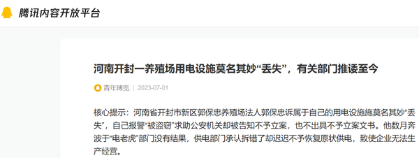 核心提示:河南省开封市新区郭保忠养殖场法人郭保忠诉属于自己的用电设施施莫名其妙“丢失”,自己报警“被盗窃”求助公安机关却被告知不予立案,也不出具不予立案文书。他数月奔波于“电老虎”部门没有结果,供电部门承认拆错了却迟迟不予恢复原状供电,致使企业无法生产经营。